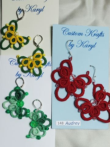 A pretty lacy design will dress up an everyday outfit. You will always get a compliment with these. This can be done in variegated or solid, as the Mexicana and Ecru in #10. (2 1/2" drop) Also shown are Green tasseled and Dark Delft Blue with a drop bead in #8 pearl cotton (13/4" plus embellishment.)